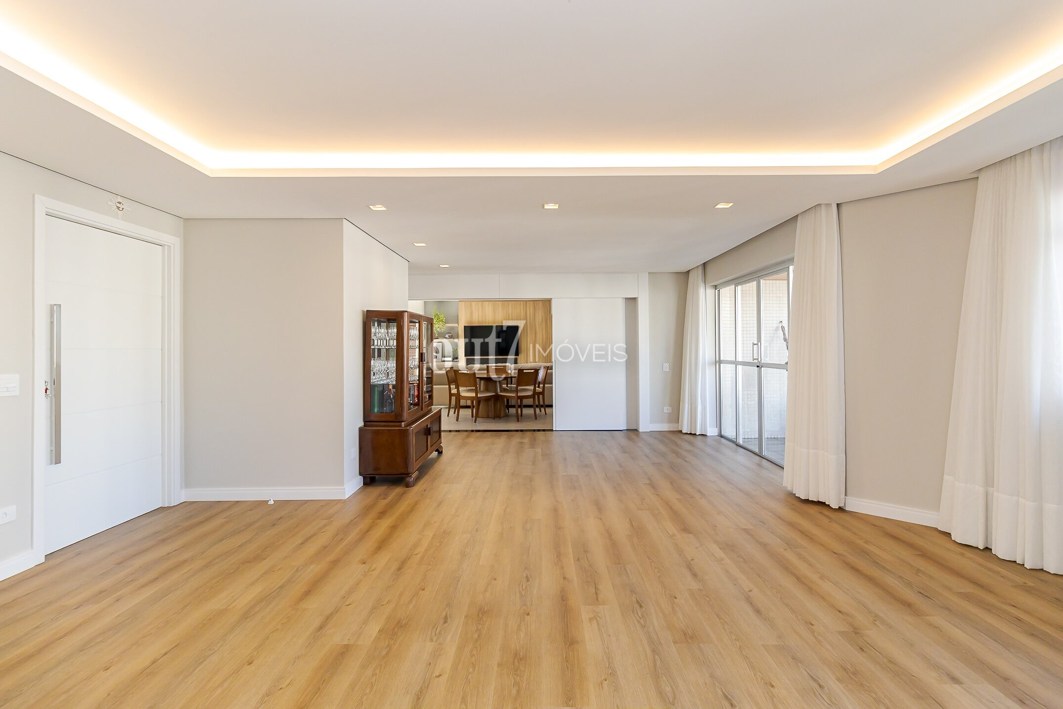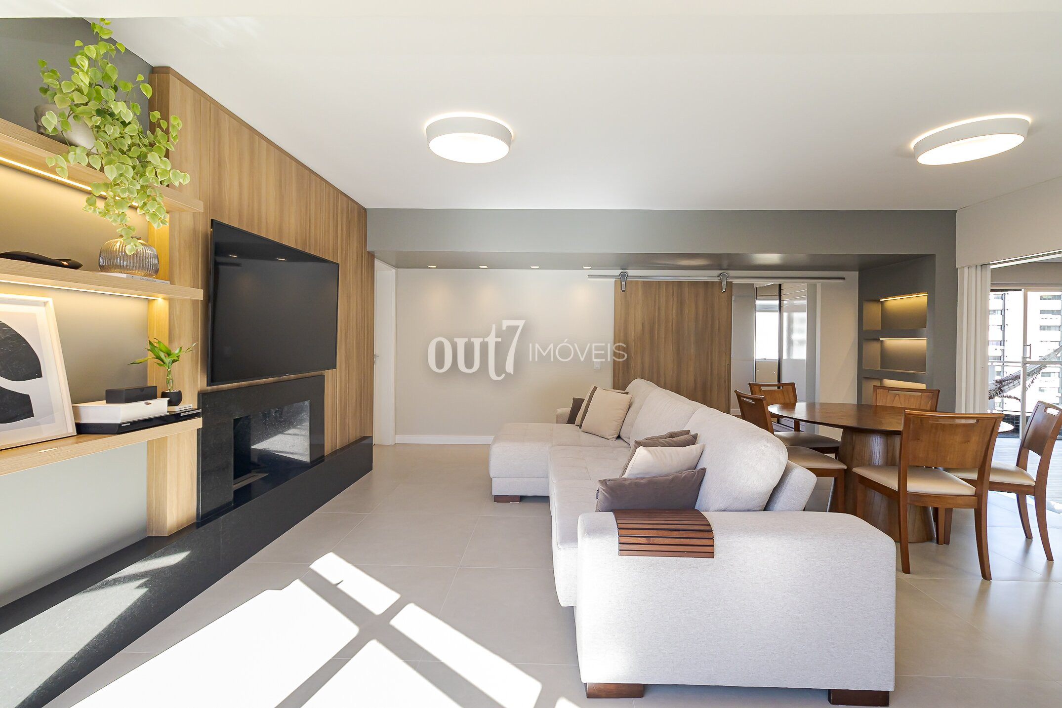 A entrada revela uma ampla sala de estar integrada à sacada, perfeita para receber com conforto e luminosidade natural.