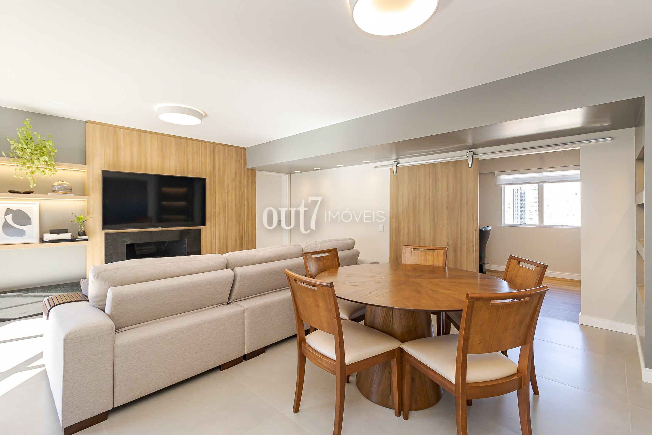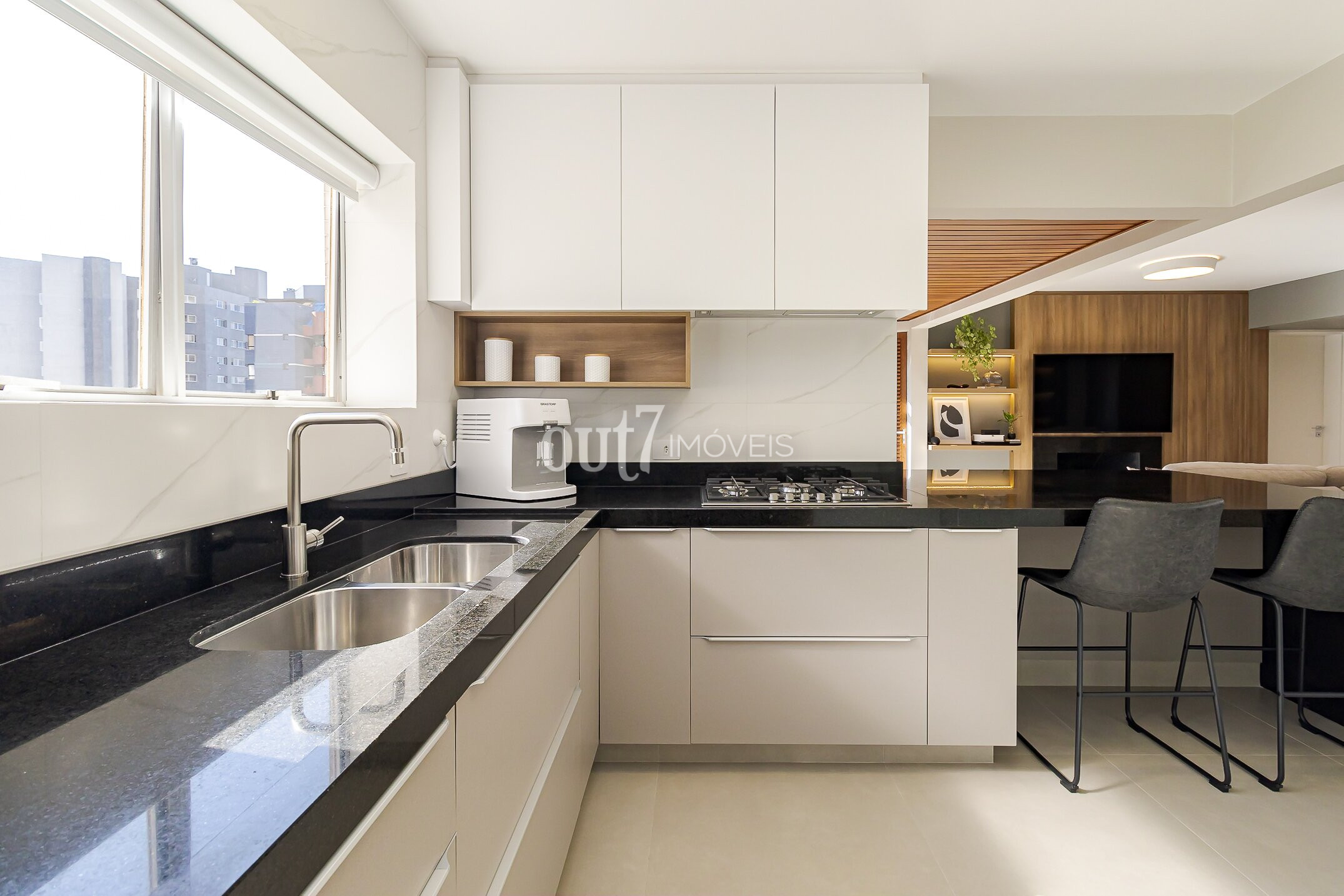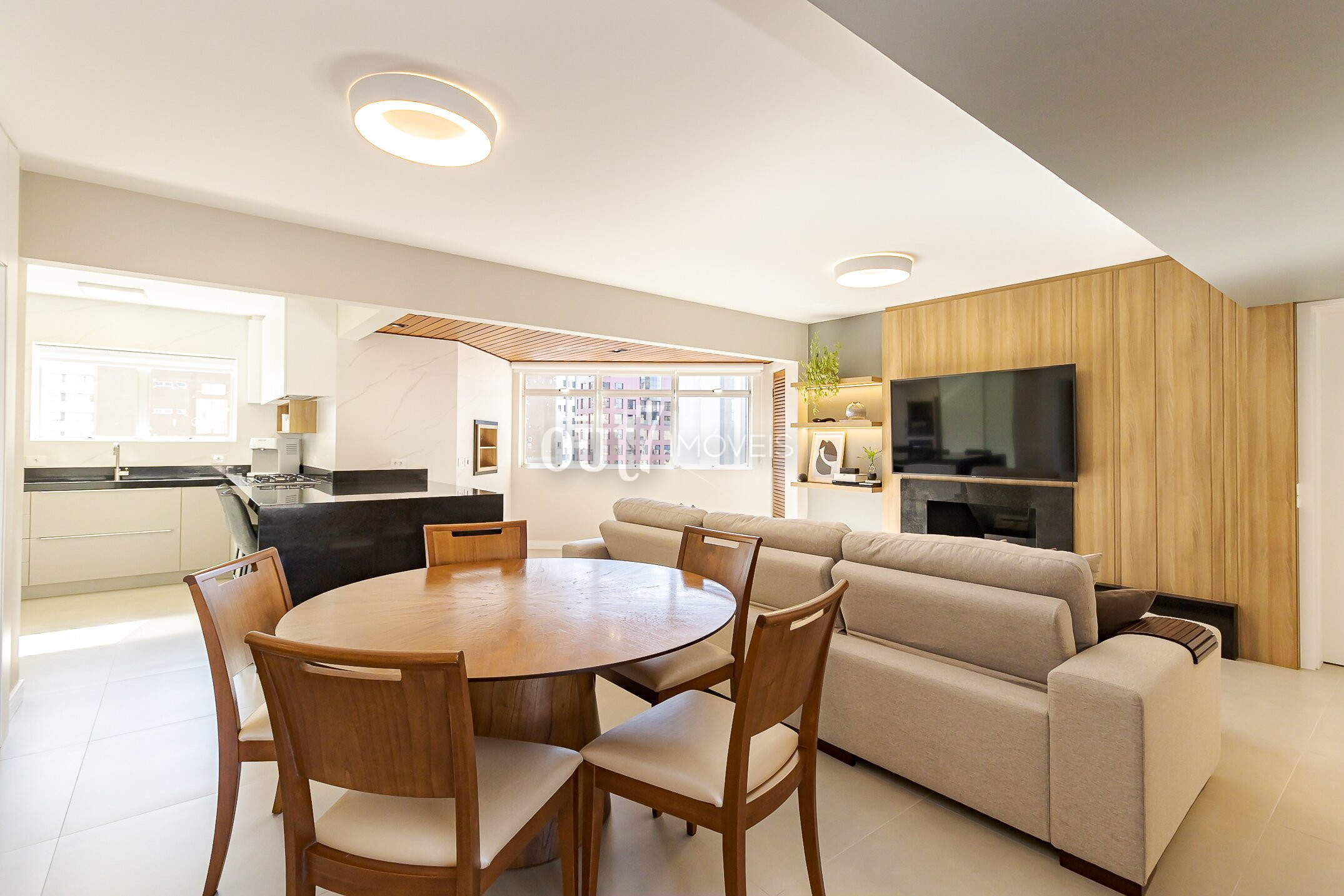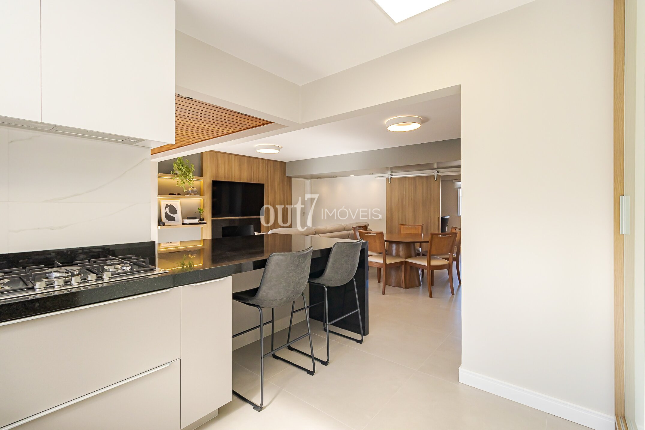 O segundo ambiente de living conta com conceito aberto, unindo sala, cozinha e um espaço integrado com churrasqueira a carvão — criando um espaço social moderno e acolhedor. Ao lado, o ambiente de home-office planejado garante praticidade e integração ao cotidiano.