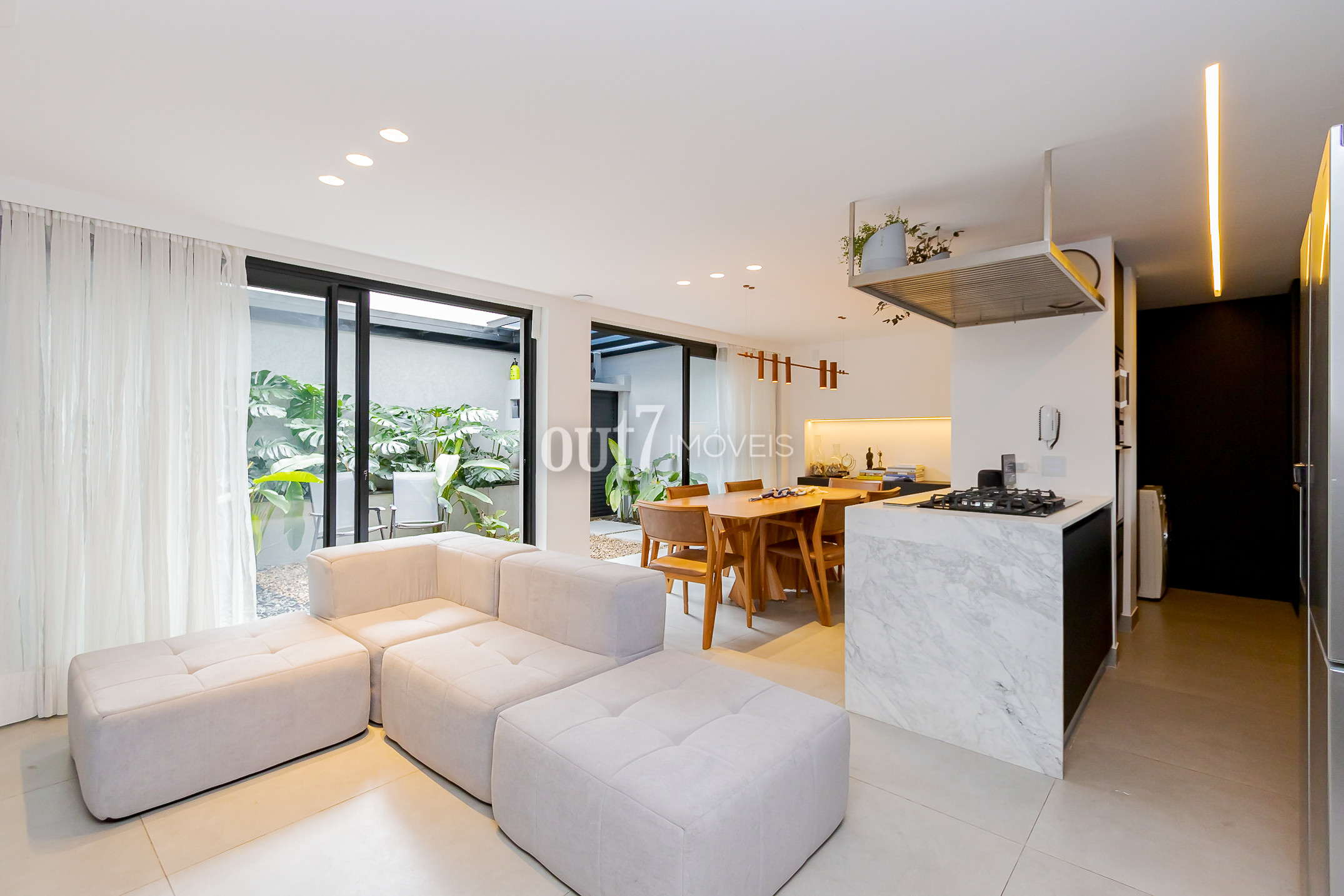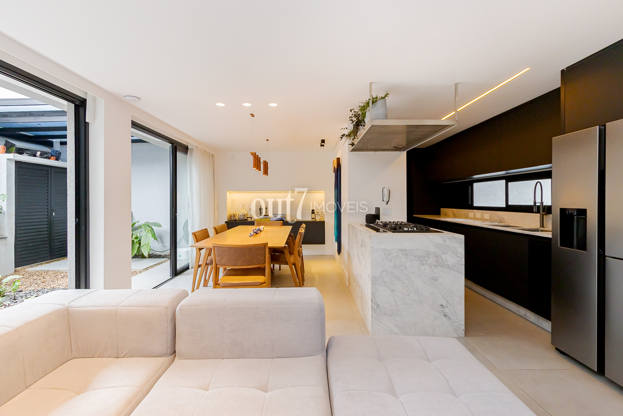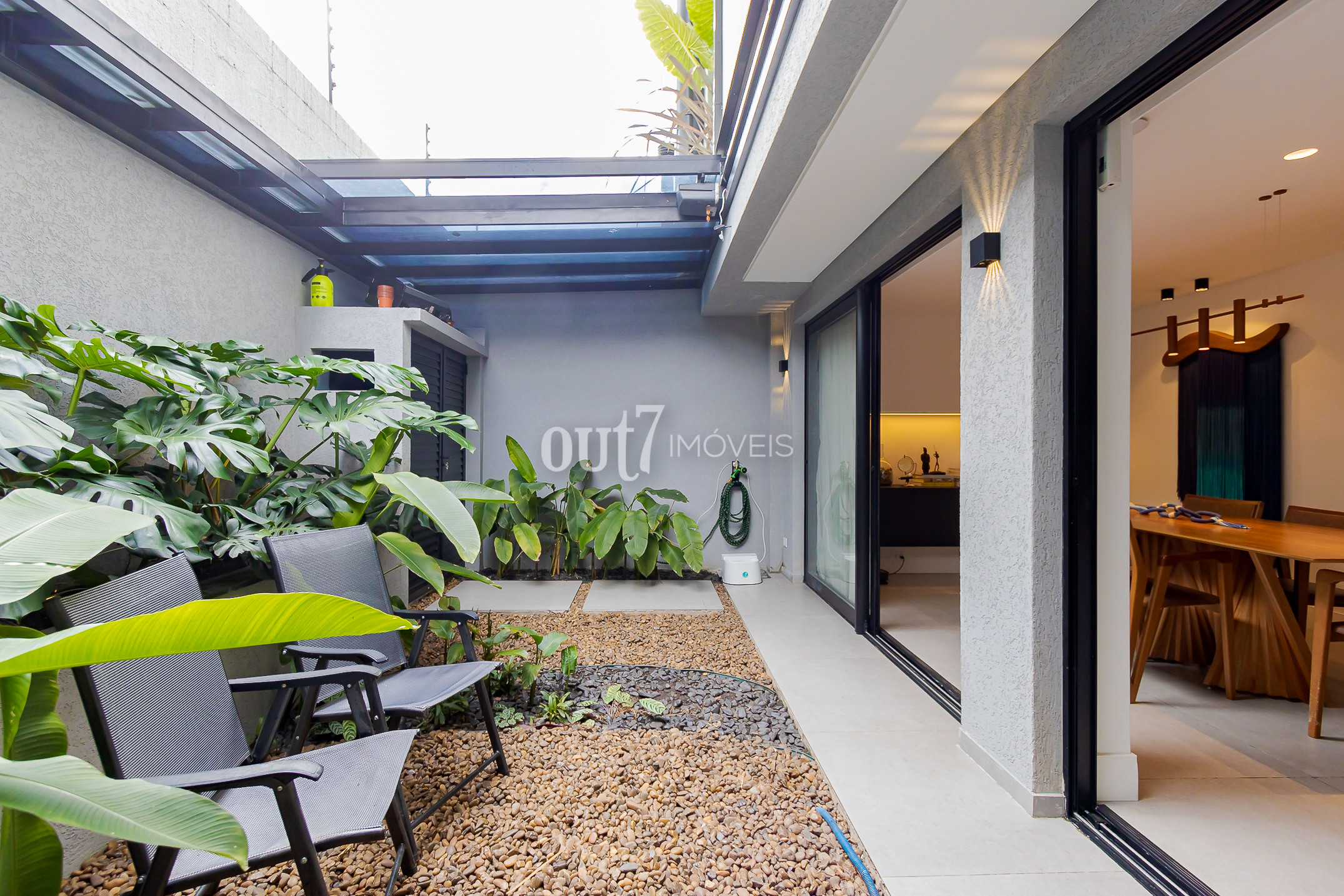 O ambiente de living é totalmente integrado, com espaços amplos para sala de estar, jantar e cozinha. A área social se conecta diretamente com o terreno nos fundos, onde há um agradável jardim com teto retrátil, ideal para momentos ao ar livre com praticidade.