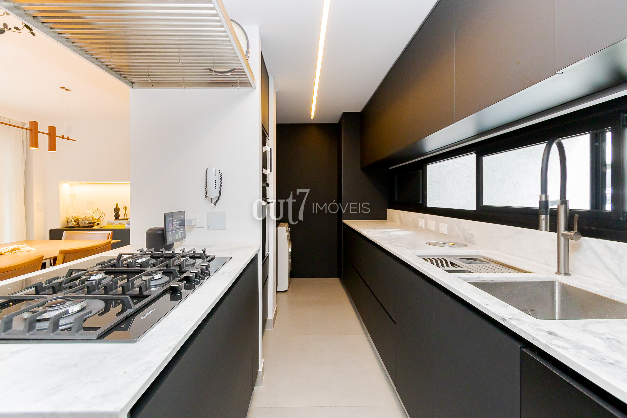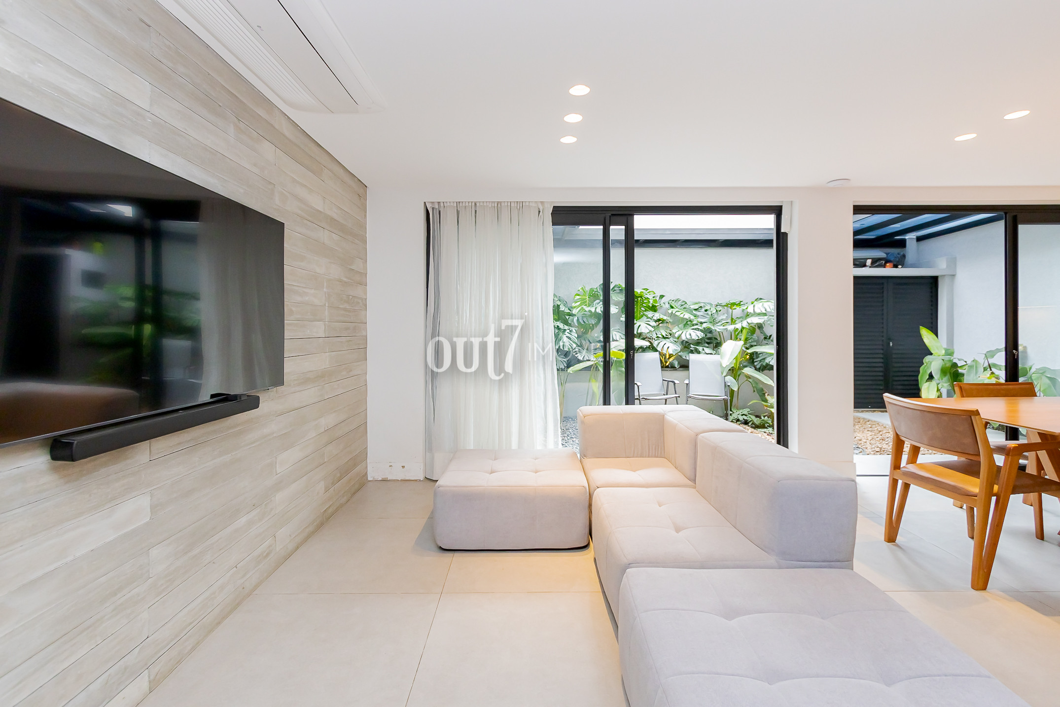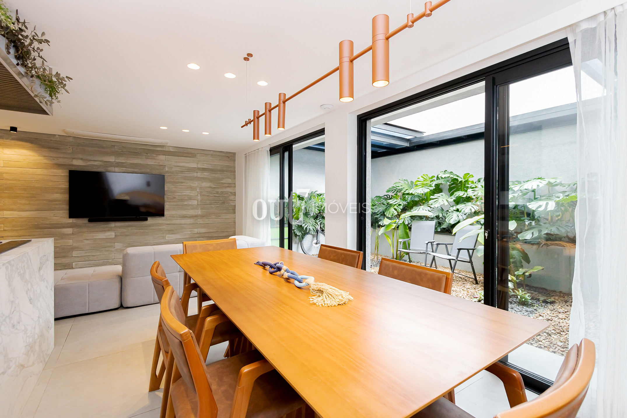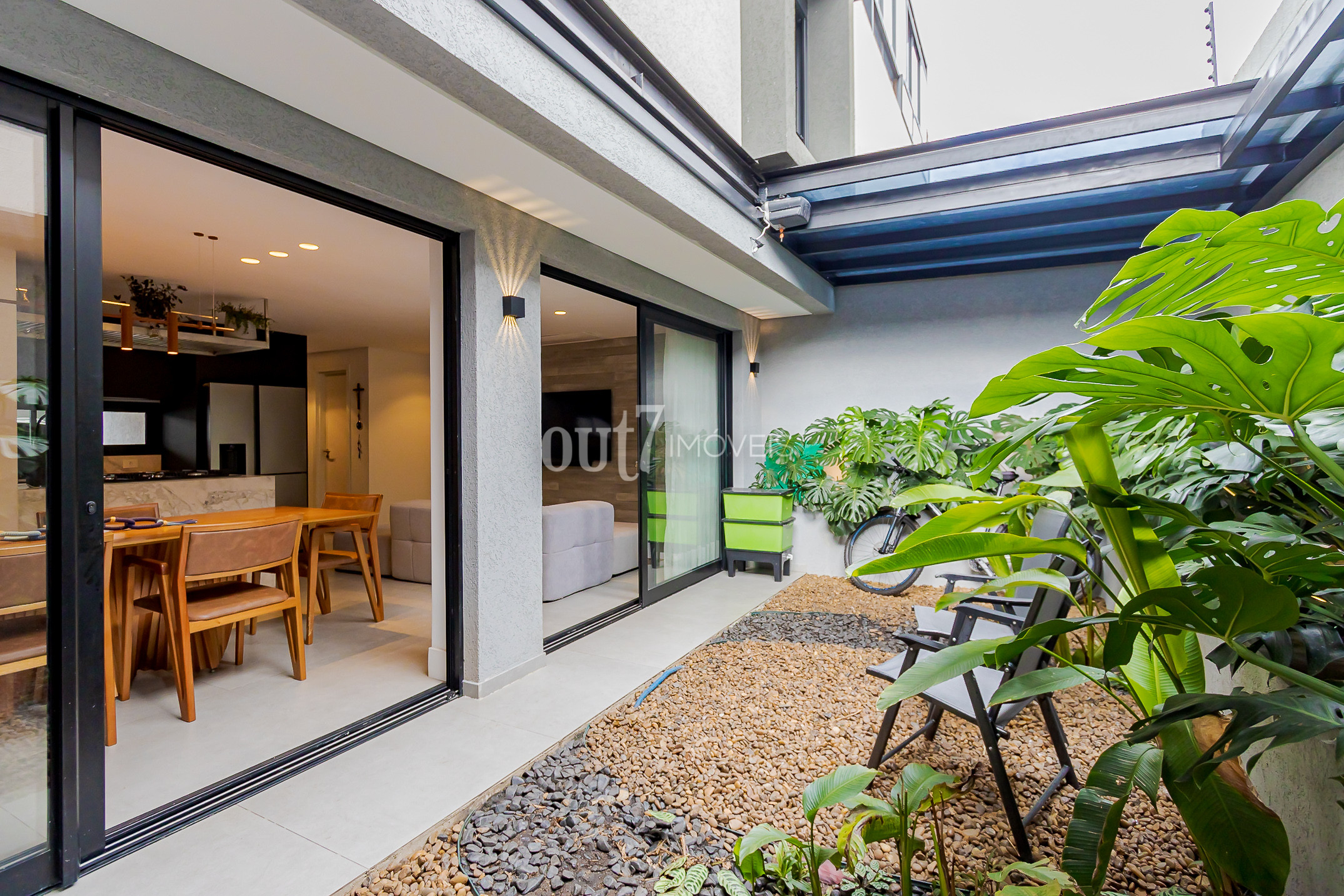 O ambiente de living é totalmente integrado, com espaços amplos para sala de estar, jantar e cozinha. A área social se conecta diretamente com o terreno nos fundos, onde há um agradável jardim com teto retrátil, ideal para momentos ao ar livre com praticidade.