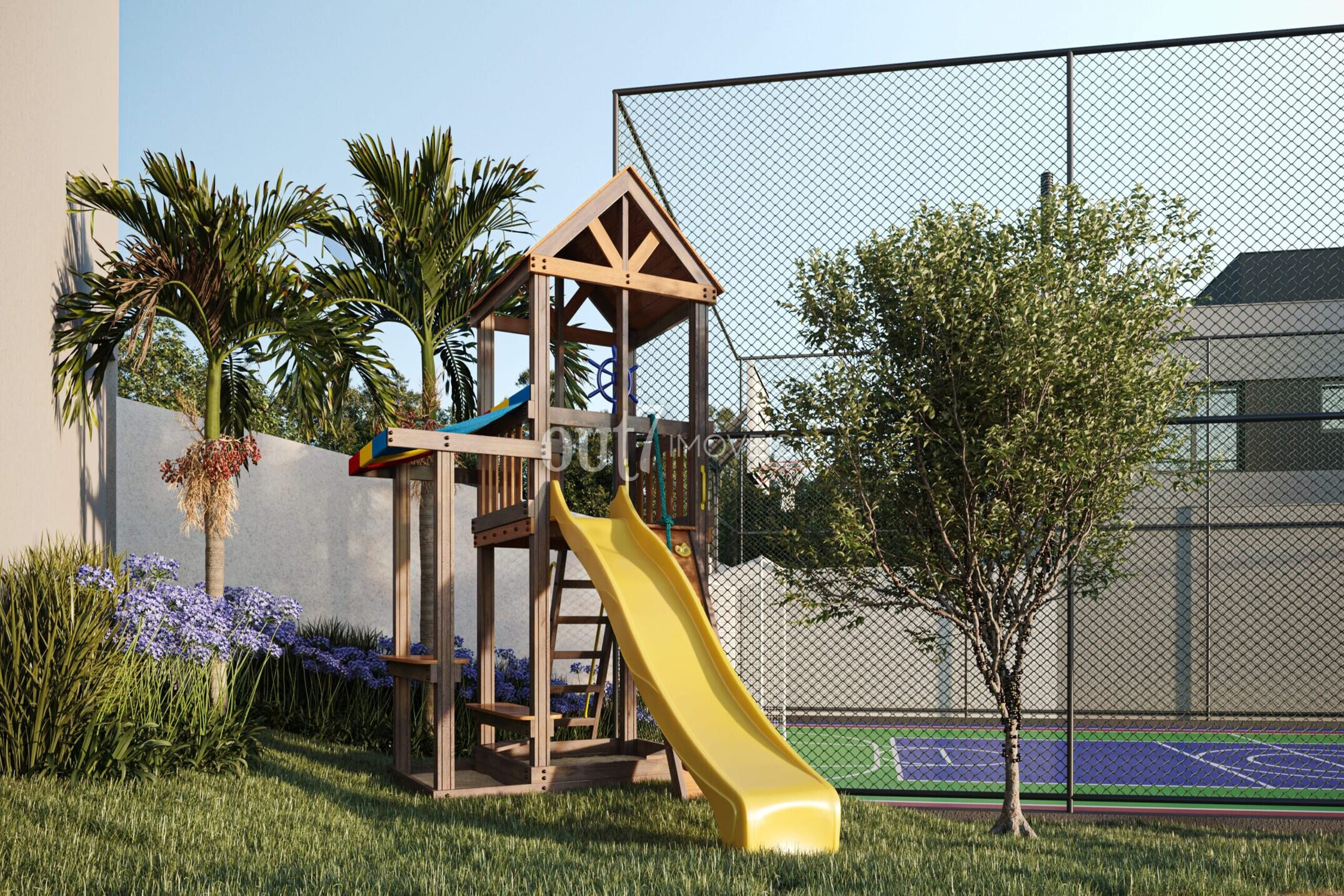 O condomínio oferece um salão de festas moderno com churrasqueira, playground, quadra poliesportiva e academia.